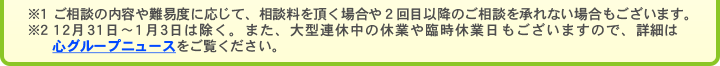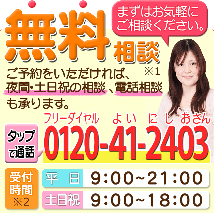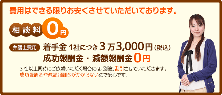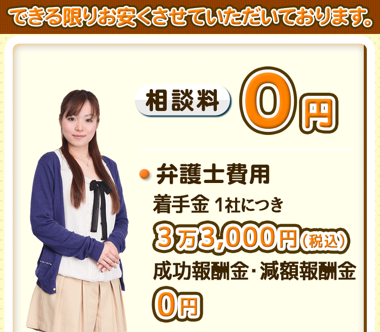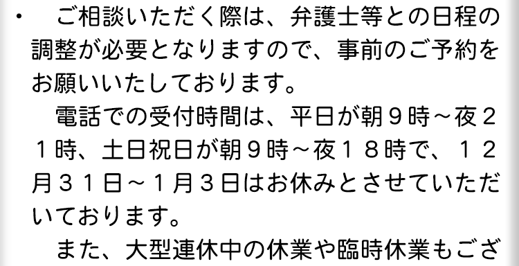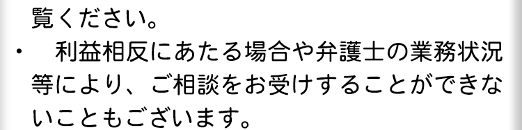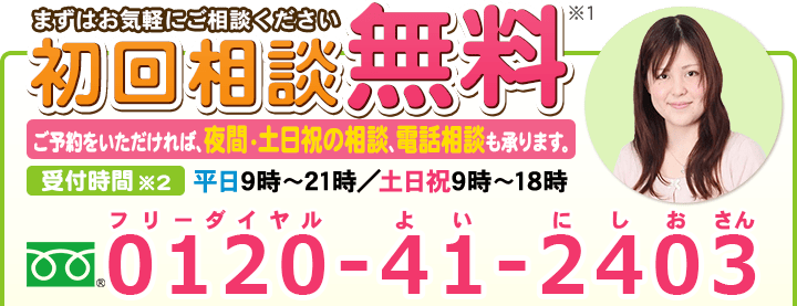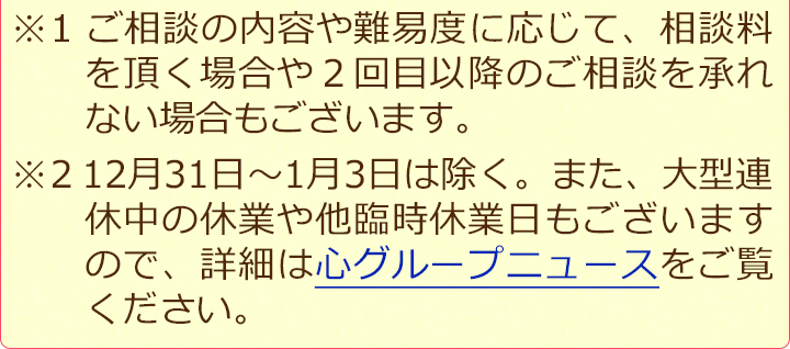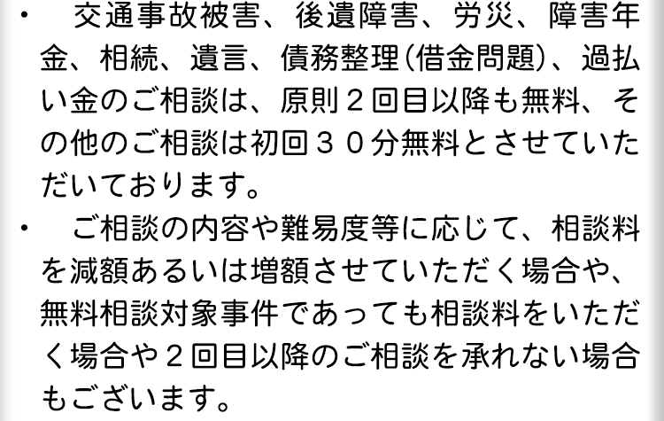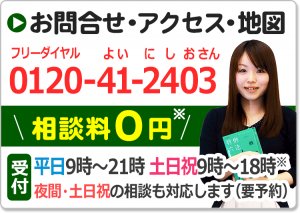 相談料に関しては一部例外等もありますので、当サイト内にある費用のページをご覧ください。