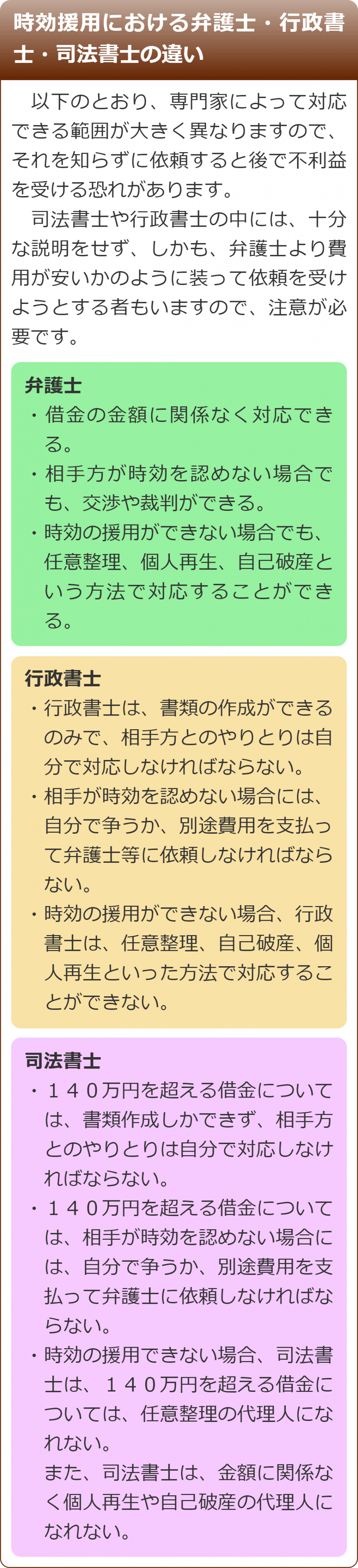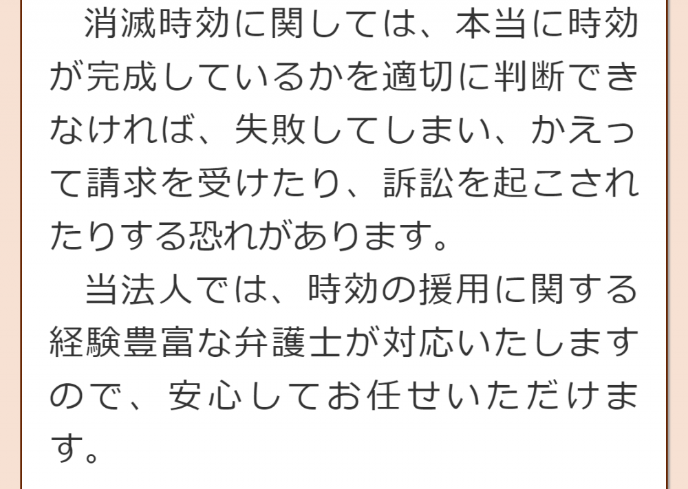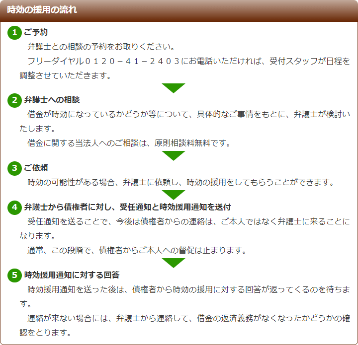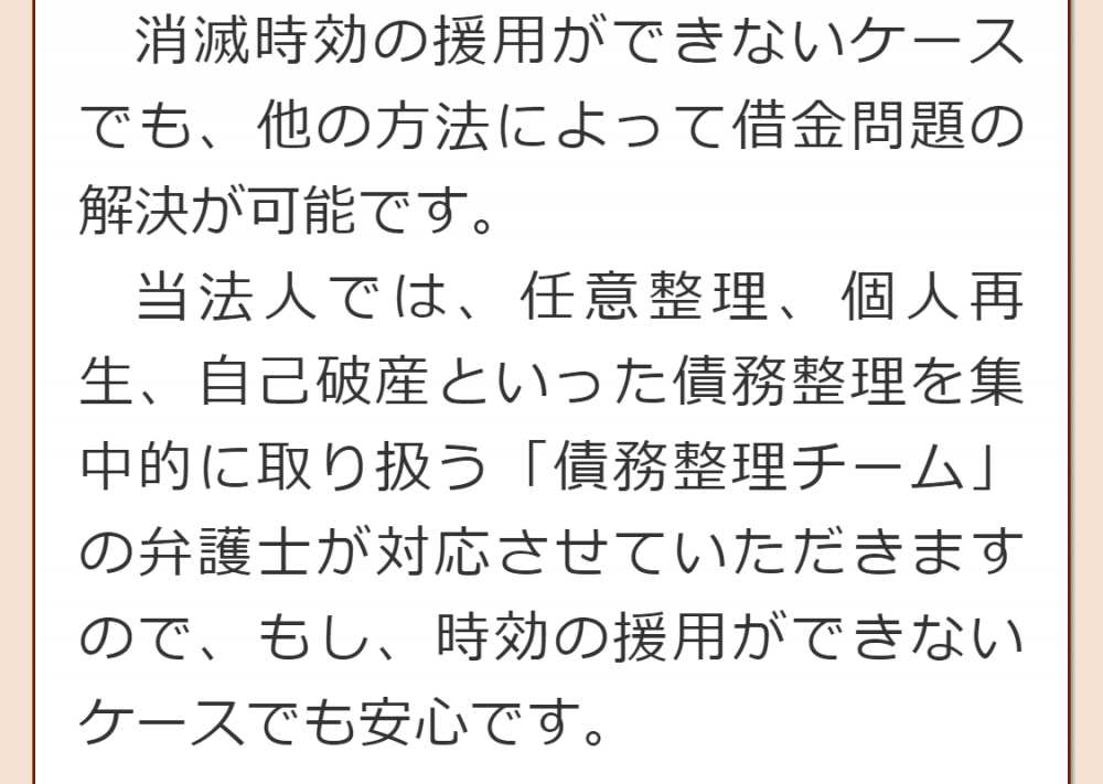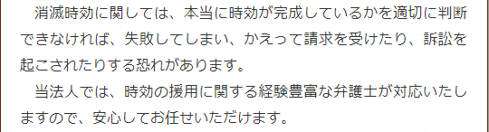 当法人には借金問題への対応を得意とする弁護士がいますので、時効の援用が成功する見込みがないような場合でも、様々な対応を検討し、別の方法による解決をご提案できる場合があります。