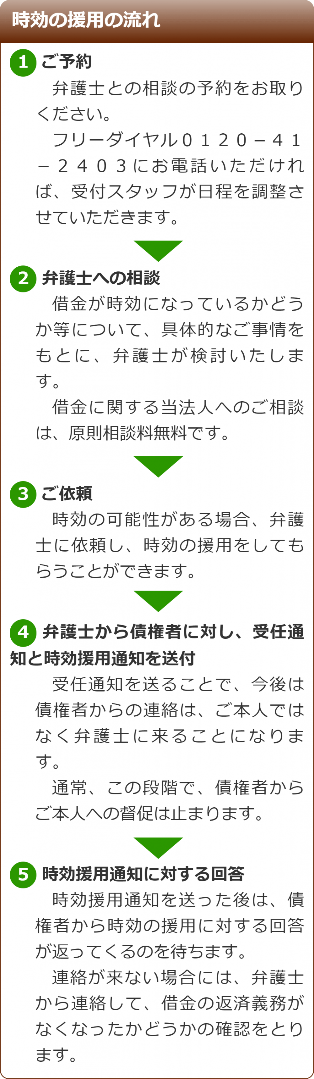 そのため、時効の援用をお考えの方はもちろん、支払督促等が来たものの時効が完成しているかどうか分からないという場合や、弁護士に依頼すべきか分からないという場合でも、お気軽にご相談いただければと思います。